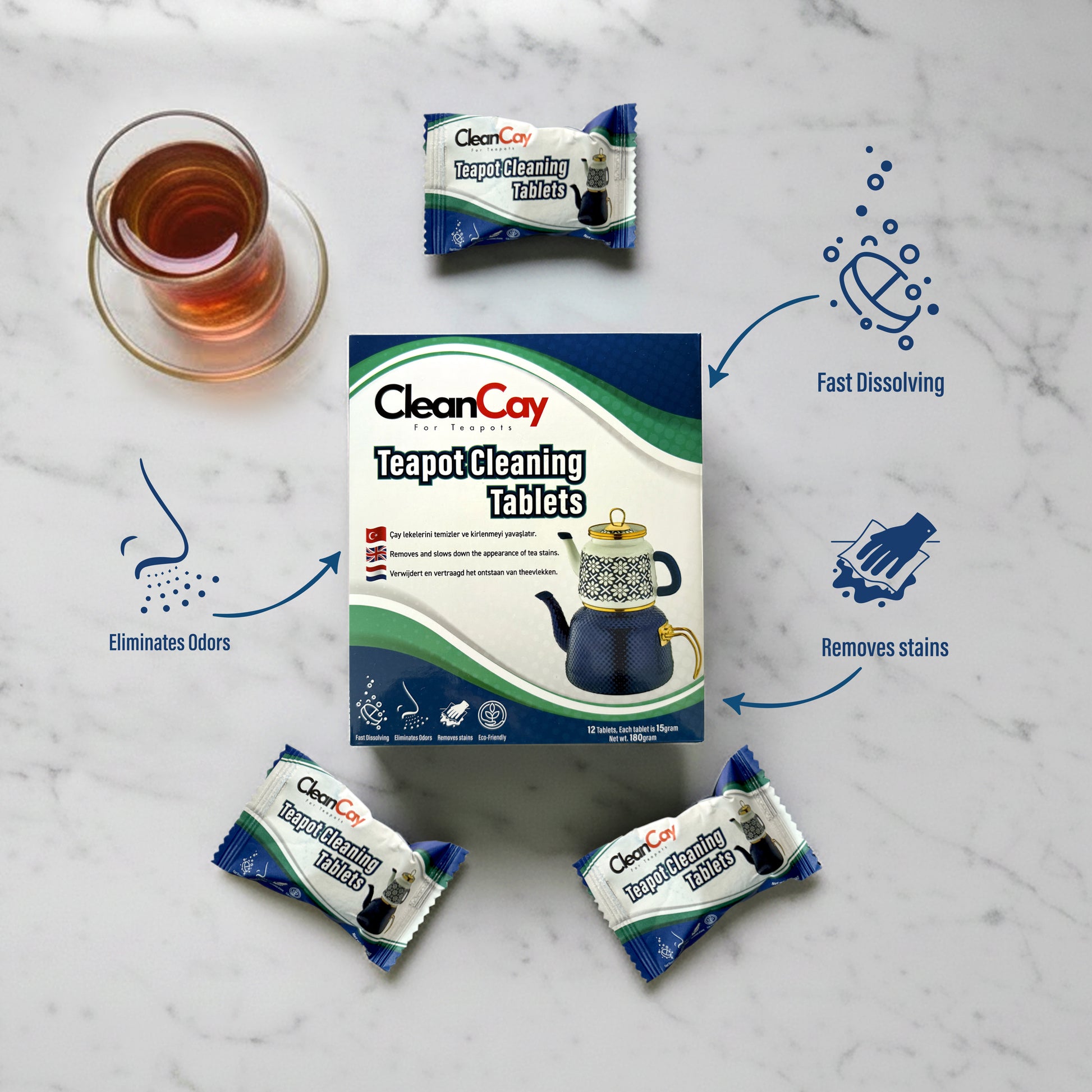 CleanCay tabletten zijn speciaal ontwikkeld voor donkere theevlekken in theepotten. Ze lossen snel op en verwijderen ingebrand aanslag, verwijderen vlekken en verwijderen stank, zonder dat u intensief moet schrobben. Maak schoonmaken moeiteloos - hier is de snelle routine in 3 stappen, zonder schrobben: